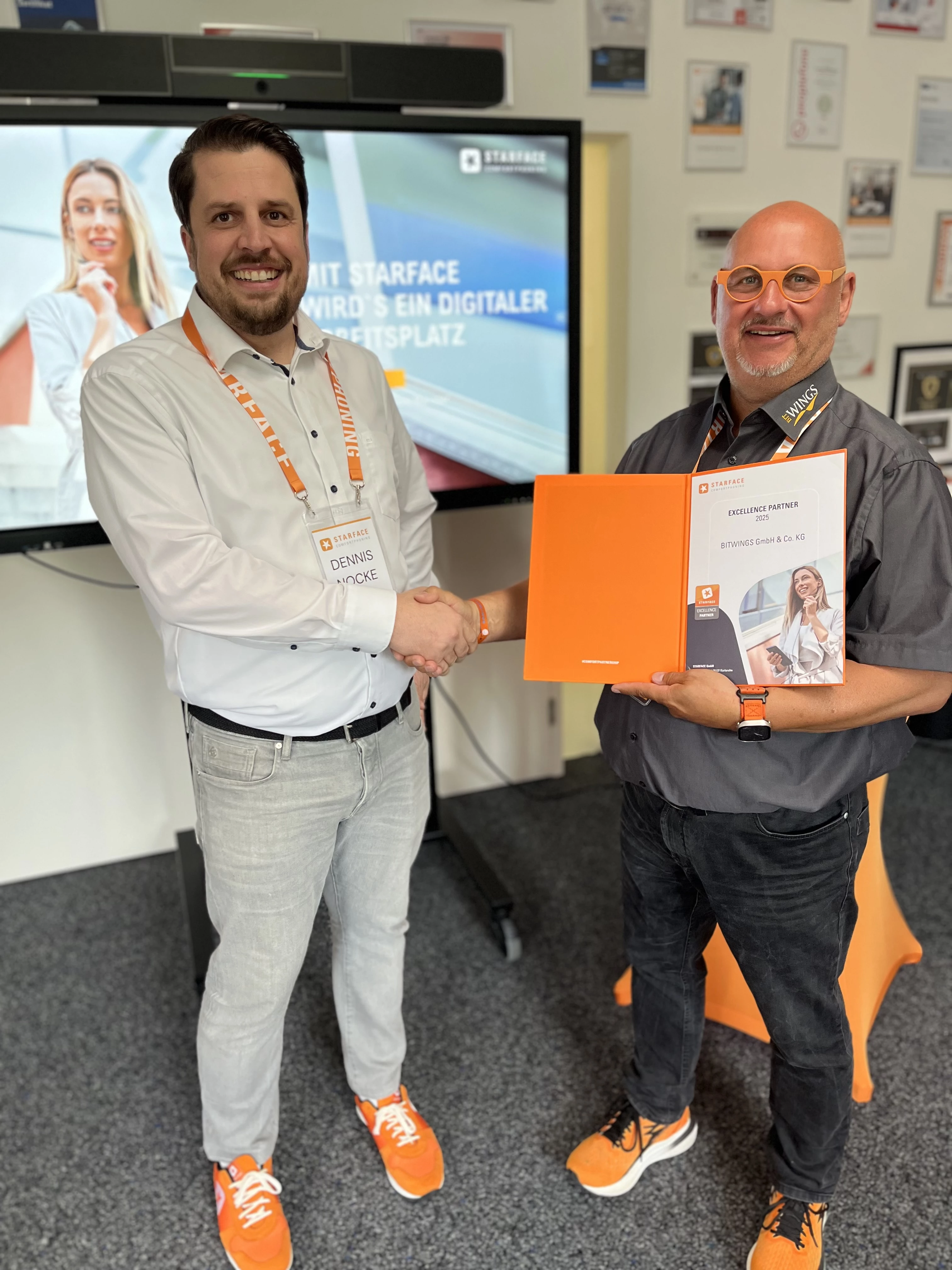 Unser Geschäftsführer Wolfgang Geng nahm die Auszeichnung persönlich von Dennis Nocke von STARFACE entgegen. Die erneute Verleihung bestätigt nicht nur unser tiefes technisches Know-how im Bereich IP-basierter Kommunikation, sondern auch die vertrauensvolle und erfolgreiche Zusammenarbeit mit STARFACE über viele Jahre hinweg.